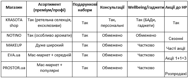 Сильні сторони. Сезонні знижки на бестселери, подарункові бокси та адвент-формати, вигідні «ритуал під ключ». Персональні консультації, швидка доставка, наявність експрес-доставки по Києву (3-8 годин).